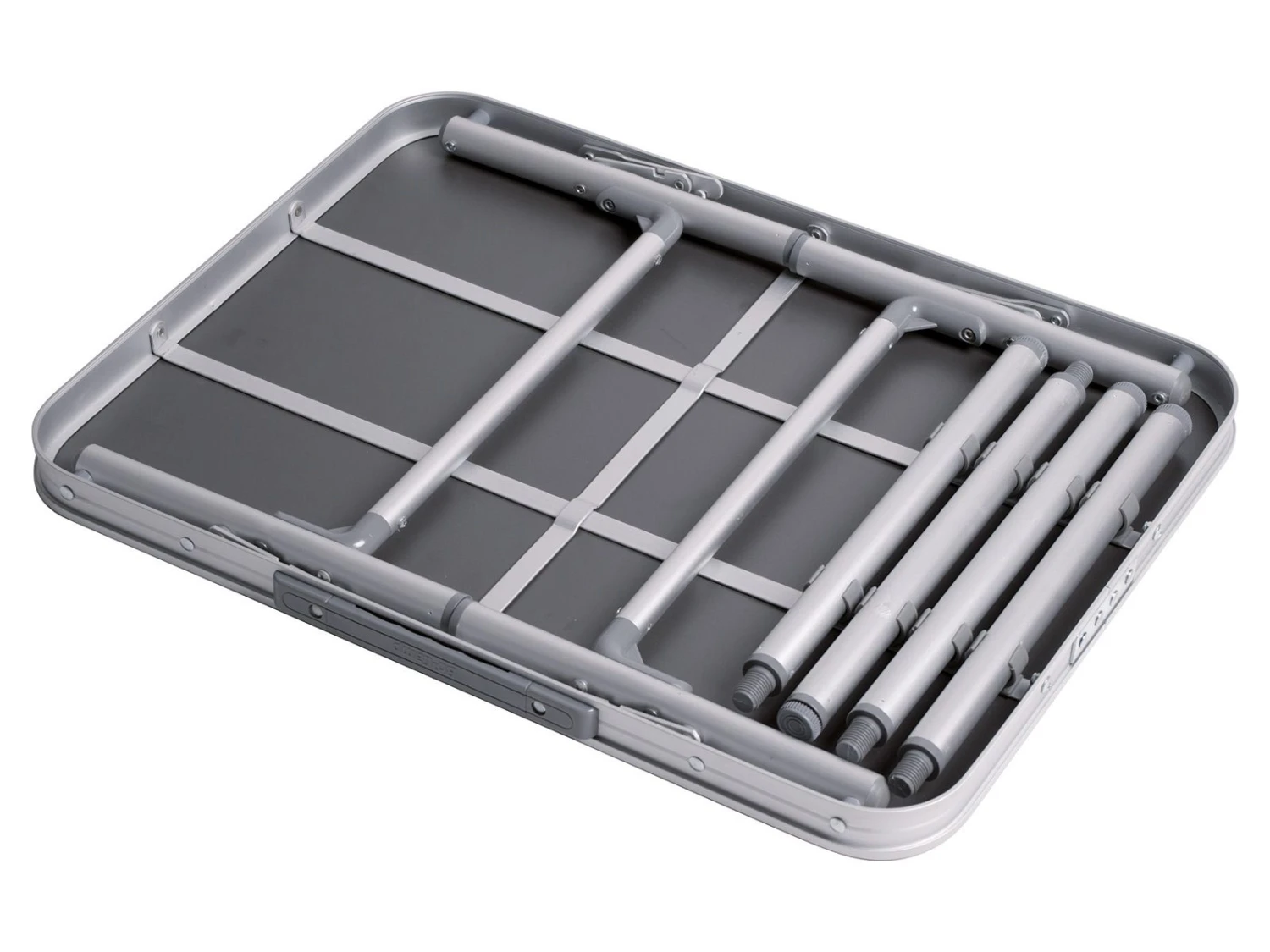 De inklapbare tafelpoten zijn gemaakt van aluminium met daarop een blad van MDF. Het tafelblad is afgewerkt met een aluminium stootrand. De tafel is niet water- en hitte bestendig. Met de stelvoetjes kun je de tafel op iedere ondergrond stabiel neerzetten. Na gebruik kun je de tafel compact inklappen tot een dikte van slechts 4 cm.