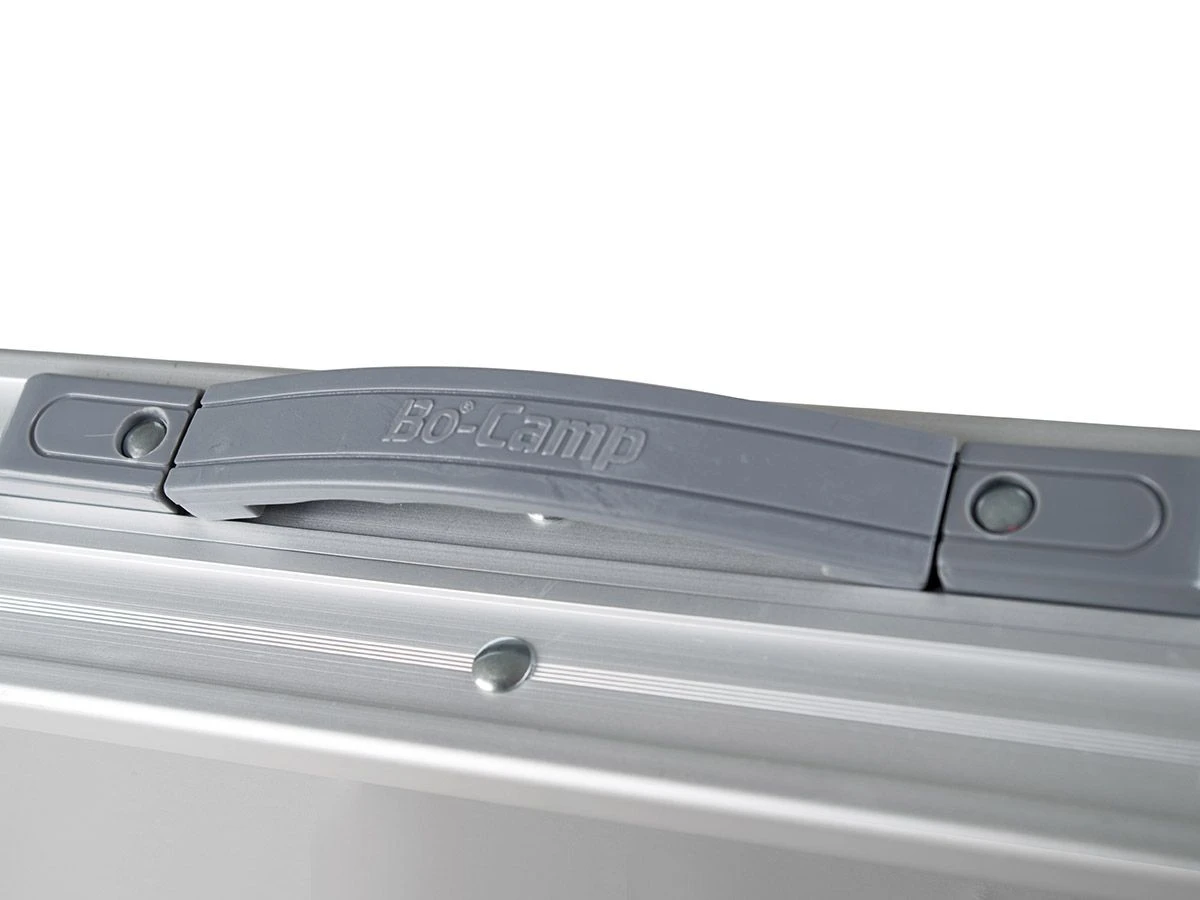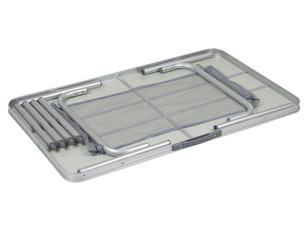 De tafel is voorzien van een lichtgewicht aluminium onderstel en een aluminium tafelblad. De tafel is dus water- en hitte bestendig!