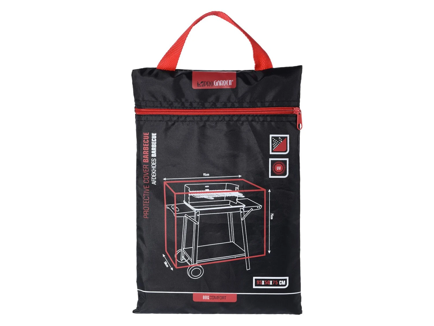 De hoes heeft een afmeting van 50 x 95 x 75 cm en is gemaakt van polyester. Onderaan de hoes zitten ogen zodat je de hoes gemakkelijk vast kunt maken.